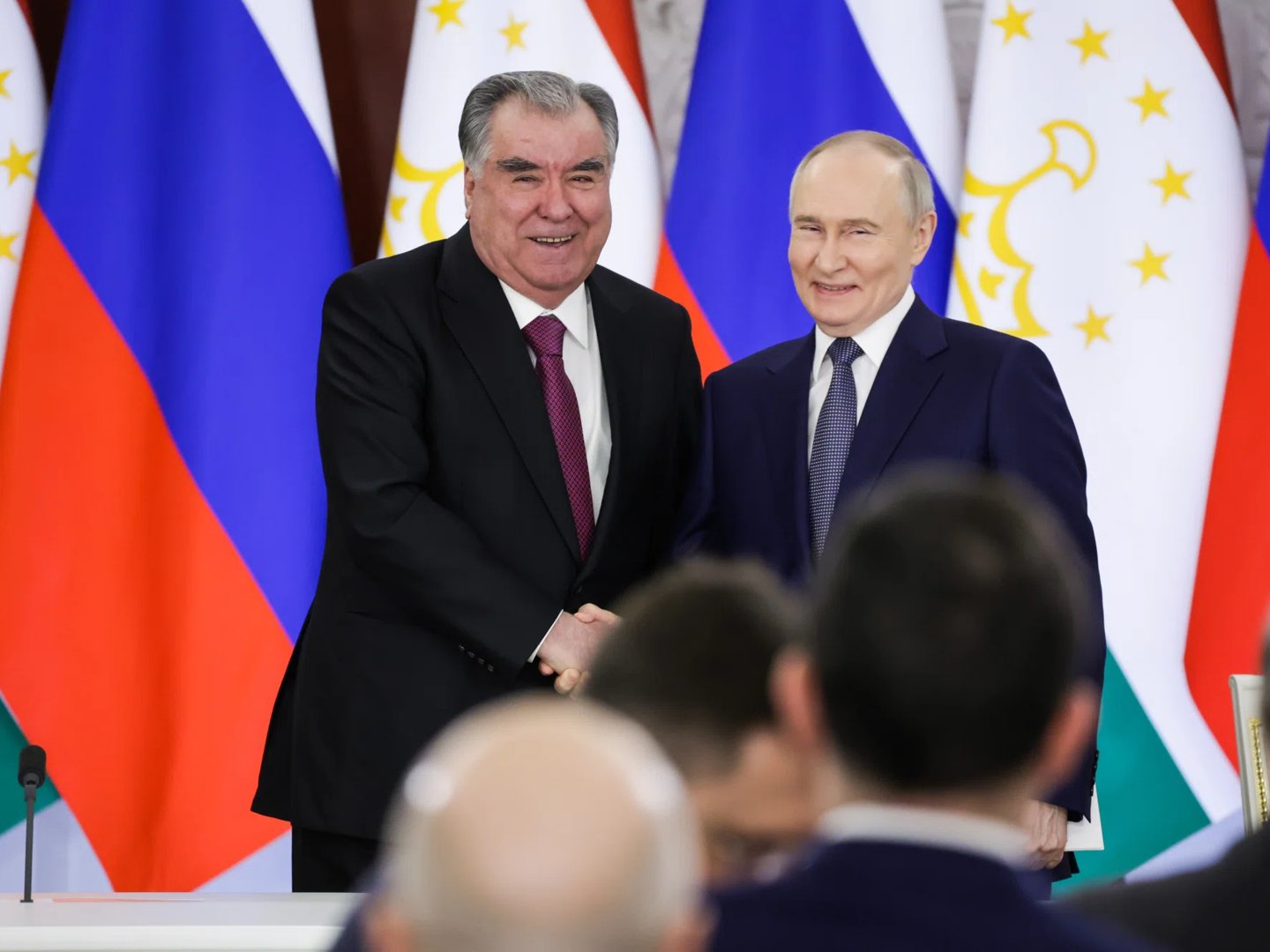 Поднявшись по лестнице дворца, Путин и Рахмон задержались немного на крыльце, откуда открывался вид не только на построившийся на площади почетный караул, но и на столицу Таджикистана. Затем зашли в здание и провели встречу тет-а-тет. Путин отметил, что статус «государственный визит», который отличает его от предыдущих рабочих и официальных поездок российского президента в Душанбе, — не просто формальность.
