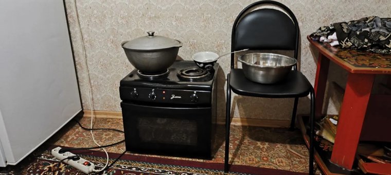 Рамшед провел нас в кухню, наполнение которой слегка удивило. Здесь нет привычного стола со стульями, зато сразу две плиты. Все это из-за традиций, которые из Таджикистана сюда привезла семья: на родине они всегда сидят на полу, поэтому стол и стулья не нужны.
