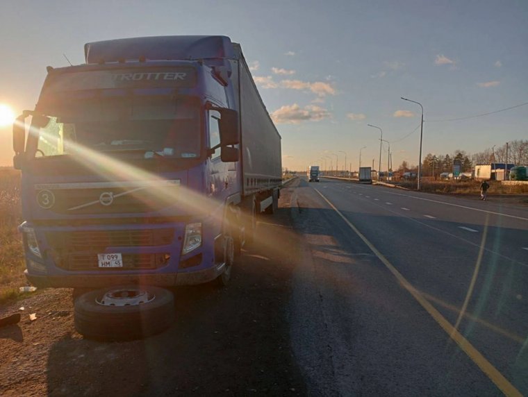 На тюменской трассе оторвавшееся от фуры колесо снесло человека на обочине. Фото